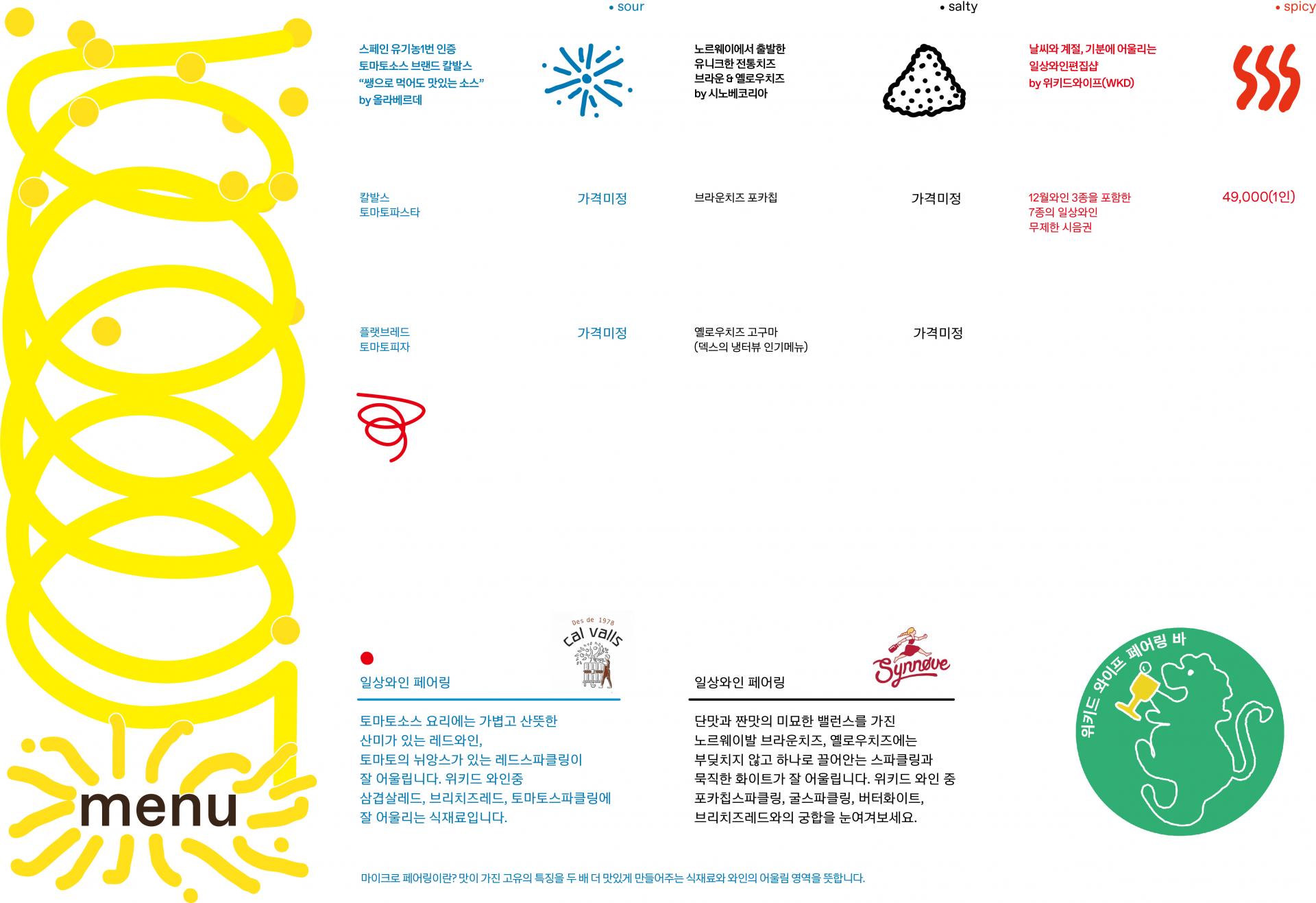➡ 요리가 함께합니다. 그냥 브랜드랑 같이 콜라보하는 브랜딩 목적이 아니라, 위키드 일상와인에 어울릴만한 음식을 낼 수 있는 브랜드로 신중한 협의 후 만난 크루들입니다. 음식이 빠진 와인시음은 앙꼬빠진 찐빵과 같다는 걸 1회차때 분명히 깨달았고, 피드백 중 '김밥스파클링엔 김밥이 먹고 싶어요!'라는 리뷰가 제일 많았기에 11월 한달을 건너뛰고 고민을 많이 한 부분입니다. 다른 식당처럼 생면파스타집, 스테이크하우스는 아니지만, 토마토소스라는 재료와 치즈라는 재료를 통해 <푸드페어링>에 중점을 둔 와인바를 운영하겠습니다.