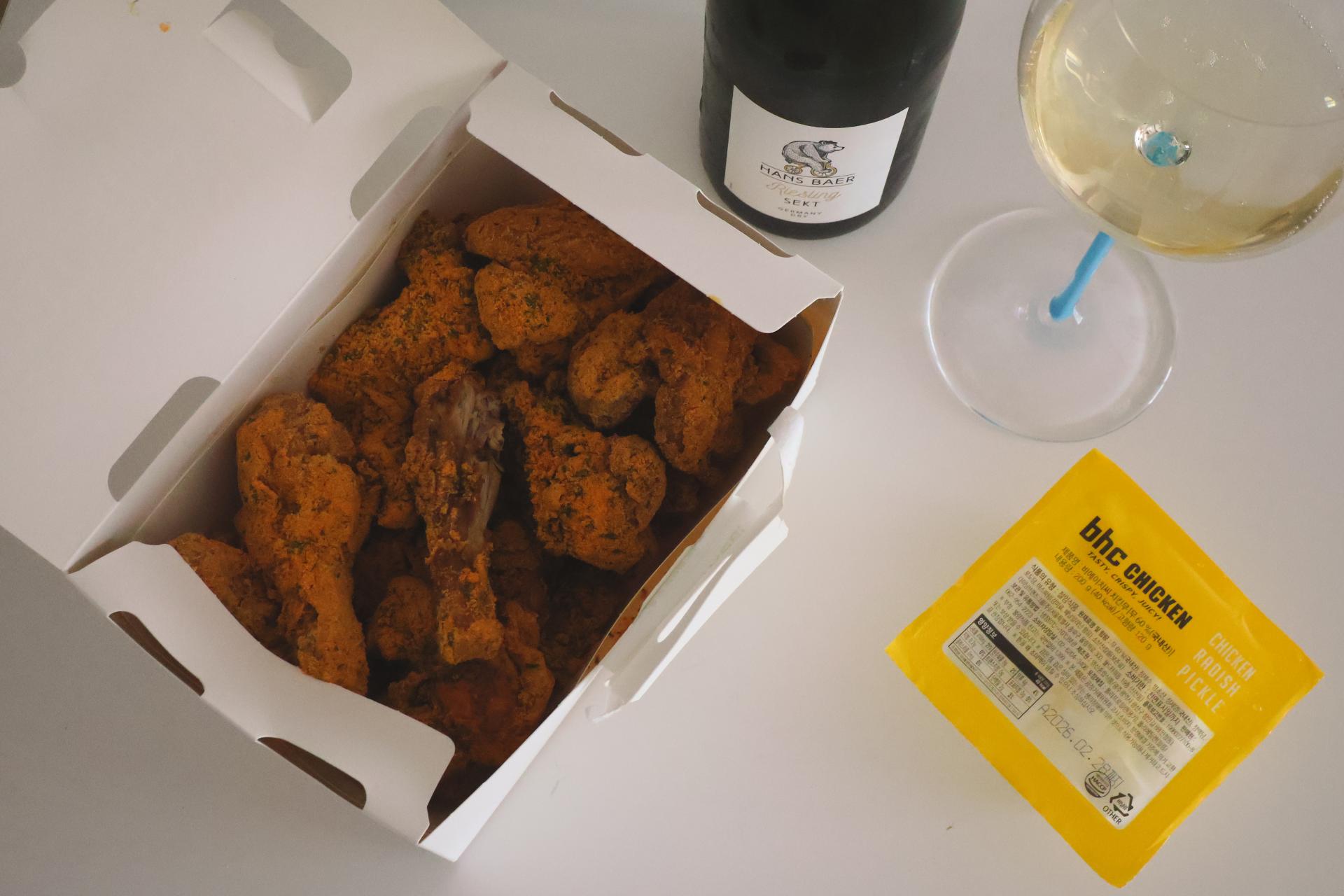 이번달 양념치킨 스파클링은 프랑스도, 스페인도, 이탈리아도 아닌 독일에서 데려왔어요. 그래서 이름이 샴페인, 크레망, 까바, 프로세코가 아니라 젝트SEKT 랍니다 🍷 이 와인은 말이죠, 평생 샴페인만 고집했던 분께는 권하지 않을래요. 모든 컨디션을 복잡하게 챙겨서 어렵게 마셔야 하는 샴페인과 달리 '즉각적으로' 엔돌핀을 치솟게 해주는 와인이거든요. 아주 살짝, 5% 정도의 단맛이 있는데 느끼하지 않아요. 명랑한 산도가 잘 받쳐주는데다, 잔을 가득 채운 기포가 뾱뾱이같은 폭소를 터뜨리기 때문일거예요. 그래서 오히려 저는 이 와인 페어링이 더 어려웠어요. 와인 자체로 너무 맛있게 느껴져서, 굳이 페어링을 할 필요가 없기 때문에 리스트에서 제할 뻔 했었죠. 그러다!! 정말 기적같은 실수로, 중앙일보 칼럼을 준비하는데 치킨을 잘못 시켜서 뿌링클이 온거예요(세상에나). 그때부터 허겁지겁 뿌링클, 고추바사삭, 블랙알리오같은 '빨간양념' 아닌 시즈닝치킨들을 시켜먹었는데, 와- 너무 되는거예요. 페리카나 또는 처갓집 양념치킨같은 빨간 치킨 가능하고요, 지코바숯불치킨이랑은 안됐어요. 그 결과 약간의 msg 시즈닝와 양념 ㅋㅋ을 커버하는 신박한 와인임을 확인하게 됐고, 오므라이스, 경양식돈까스에 딸려나오는 '케찹'이랑도 부딪치지 않는 걸 알게 되었답니다. 이번달 스파클링은 장난기가 넘치고 무엇보다 귀여워요. 단 와인은 싫어하는 분들 걱정마세요. '달아!!!' 이 느낌이 아니거든요. 세련된 청포도의 순수한 단맛으로 시작해 다양한 페어링을 가능하게 해주는 요번달 와인을 차갑게 칠링해서 드셔보세요!